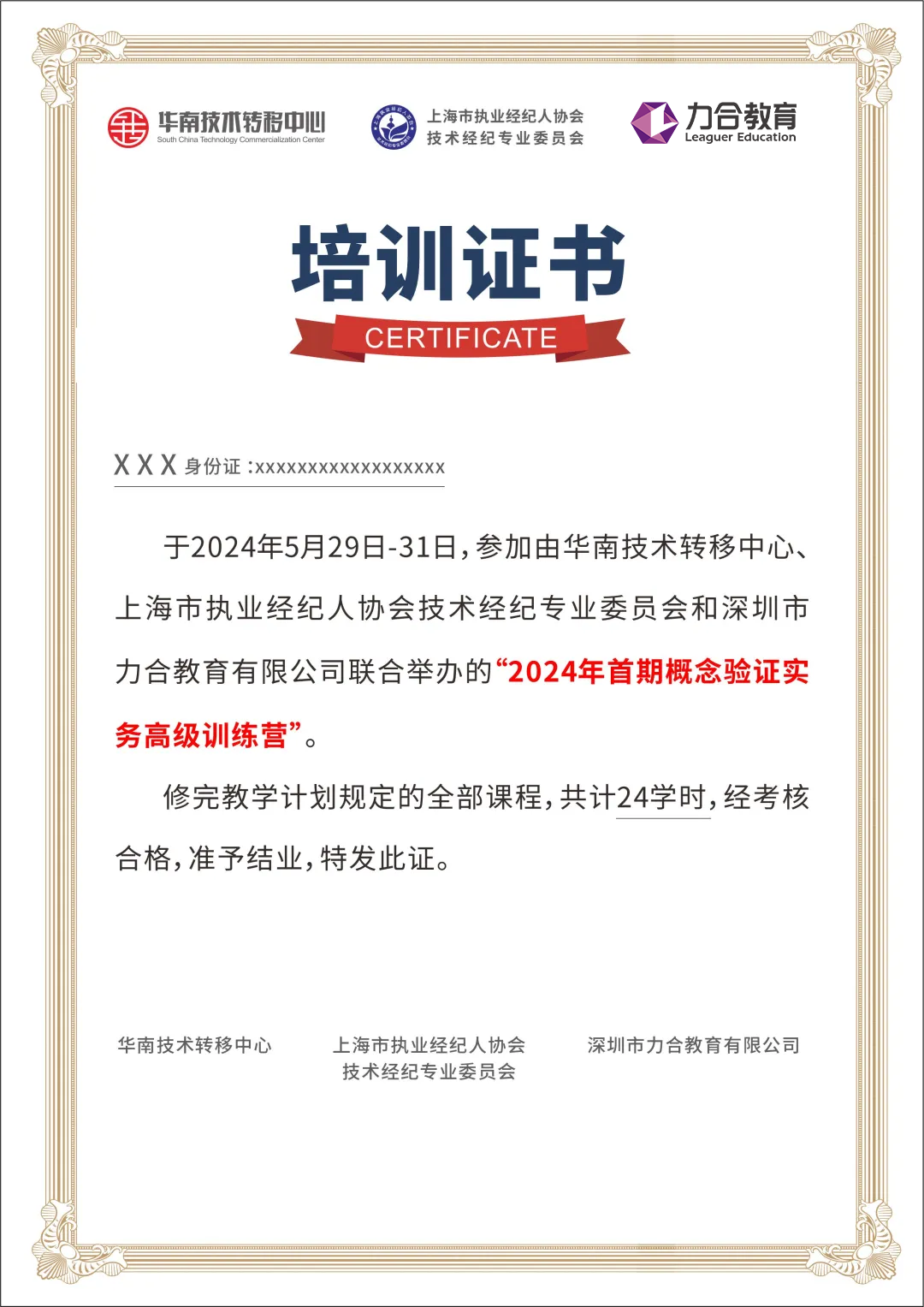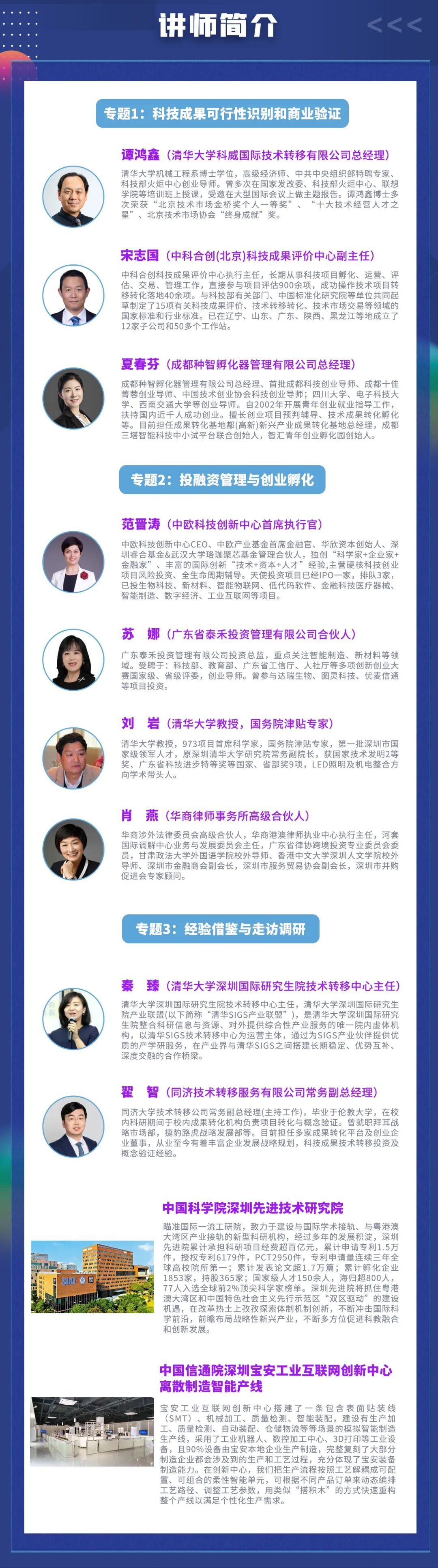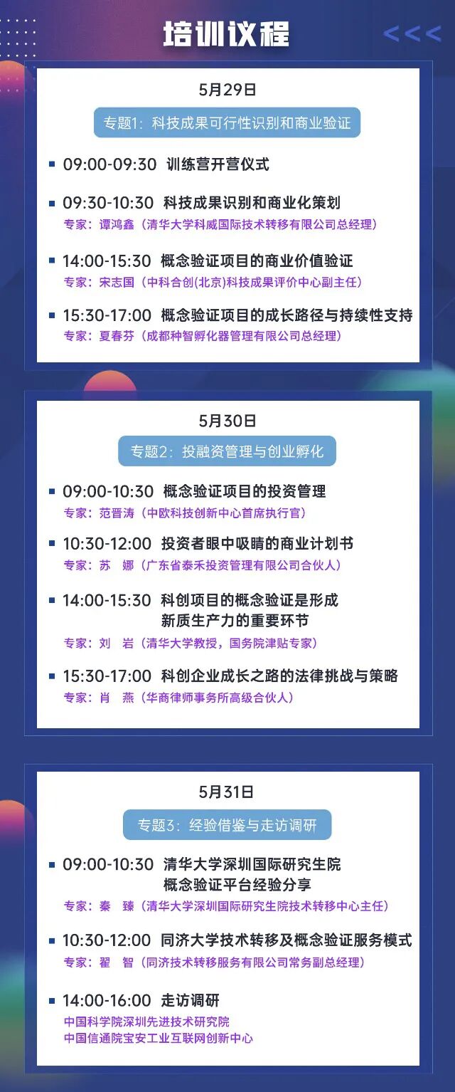 一、组织机构 主办单位: 深圳市力合教育有限公司 华南技术转移中心 上海市执业经纪人协会技术经纪专业委员会 协办单位: 广东省技术市场协会 二、培训时间、地点、方式 培训时间:5月29日-31日,共3天 线下地点:深圳清华大学研究院 培训形式:线下学习/线上直播(可自选) 三、培训对象 (一)高校院所科技成果转化管理干部、教授专家、相关科研人员等; (二)各地方概念验证中心管理人员和工作人员; (三)各工研院、产研院、新型研发机构、中试基地、创新中心等相关人员; (四)各地方科技、工信、发改等政府行政管理主管单位管理干部; (五)各地方高新区、经开区、产业园、孵化器等部门负责人; (六)感兴趣的技术专家、服务机构代表等。 四、培训日程(以实际为准) 五、培训证书 参与培训的学员可获得由华南技术转移中心、上海市执业经纪人协会技术经纪专业委员会和深圳市力合教育有限公司联合出具的“2024年首期概念验证实务高级训练营”培训证书,培训共计24学时。 证书作用如下: (一)项目申报:可用于申报政府产学研/技术转移类/知识产权类/技术平台类/孵化育成类/成果评估类等项目的证明材料之一,证书终身有效; (二)职称申报:按照各省《技术经纪人工程技术人才职称评价标准条件》指引,培训证书可作为继续教育学时及职称申报的辅助材料使用; (三)资源对接:持证学员纳入华南技术转移中心和上海市执业经纪人协会技术经纪专业委员会的人才库,有机会参与主办单位承接和对接的各类概念验证项目,共享资源; (四)持续学习:优先参与主办单位举办的各类公益培训活动,含技术转移类、科技评估类、成果孵化类、概念验证类等,助力学员终身学习; (五)优秀评选:可作为本人从业水平证明之一,有机会获评年度“广东省十佳技术经纪人”,目前评选已开展两届,得到同行高度关注。 六、培训费用 培训费4980元/人(含培训费、教材费、午餐费、证书费、税费等),学员前往培训场地的交通和食宿费用自理。汇款请备注“学员姓名”。培训转账方式为: